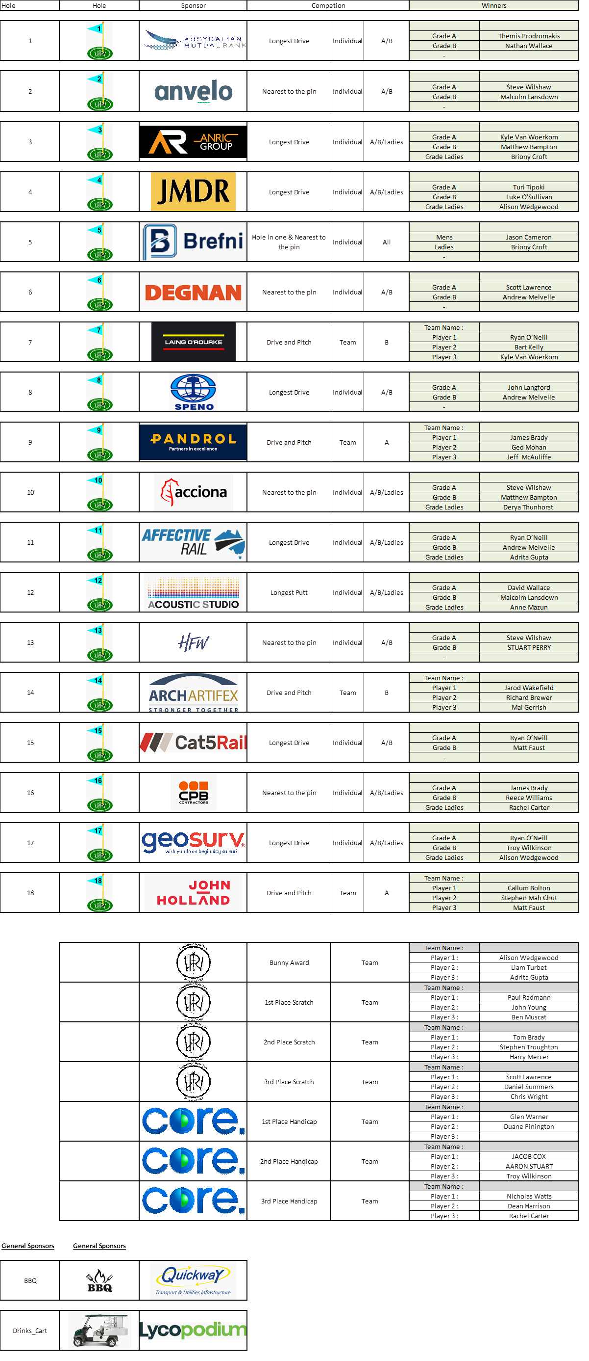 Sponsors are required to provide prizes for their Hole (the value of which is the Sponsors choice). Generally; 3 prizes for a team event hole (i.e. drive and chip) and two prizes for individual events such as nearest the pin, longest drive, etc. (i.e. prize for both the A & B grade winners).