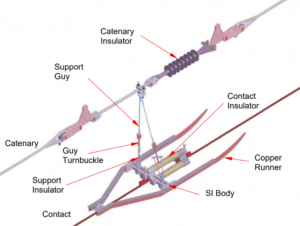 The Overhead Wiring (OHW) is known by many names such Overhead Catenary System (OCS), Overhead Line Equipment (OLE and OHLE), but regardless the name, the OHW is aerial conductor wires installed over the track to power electric trains via the pantograph.